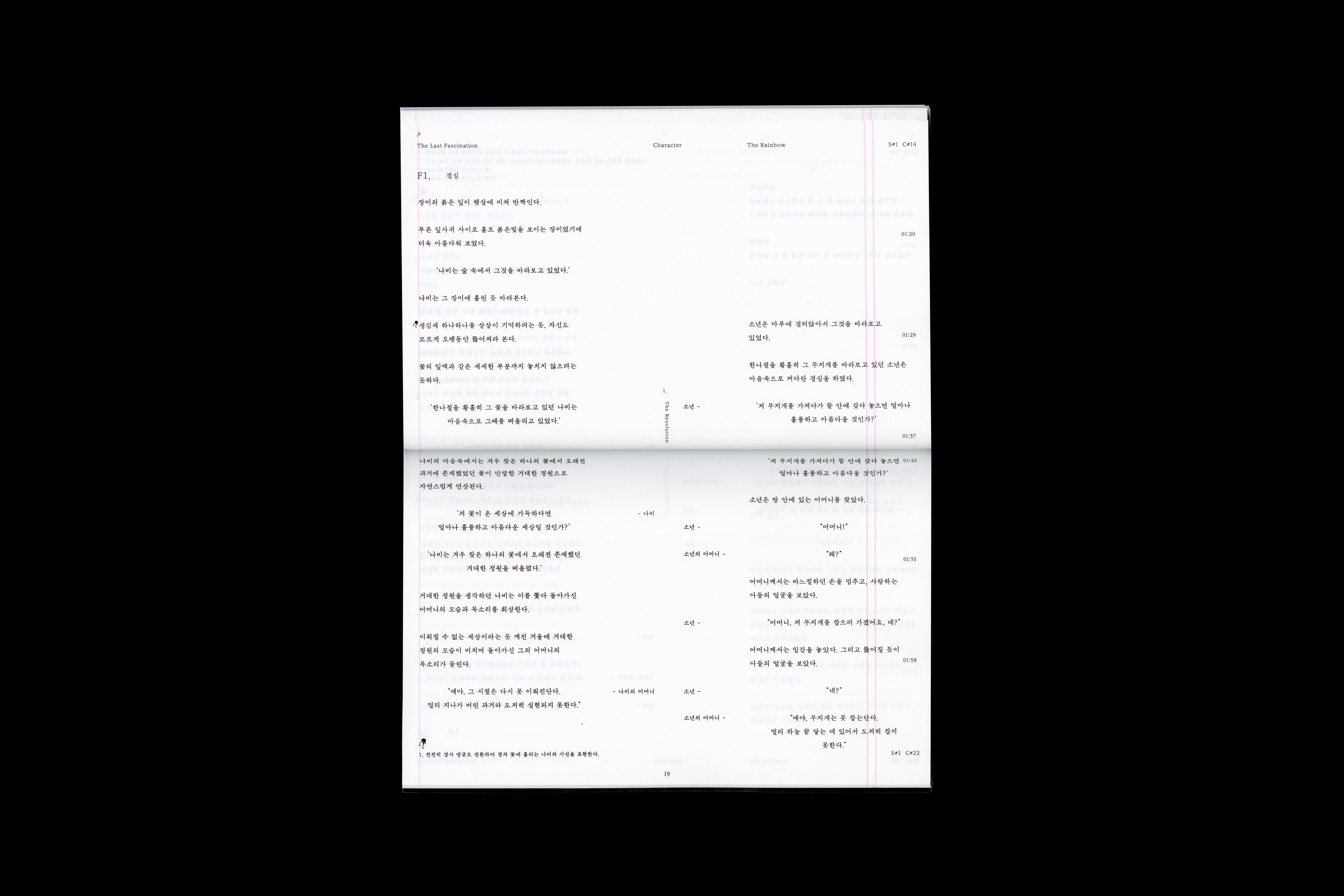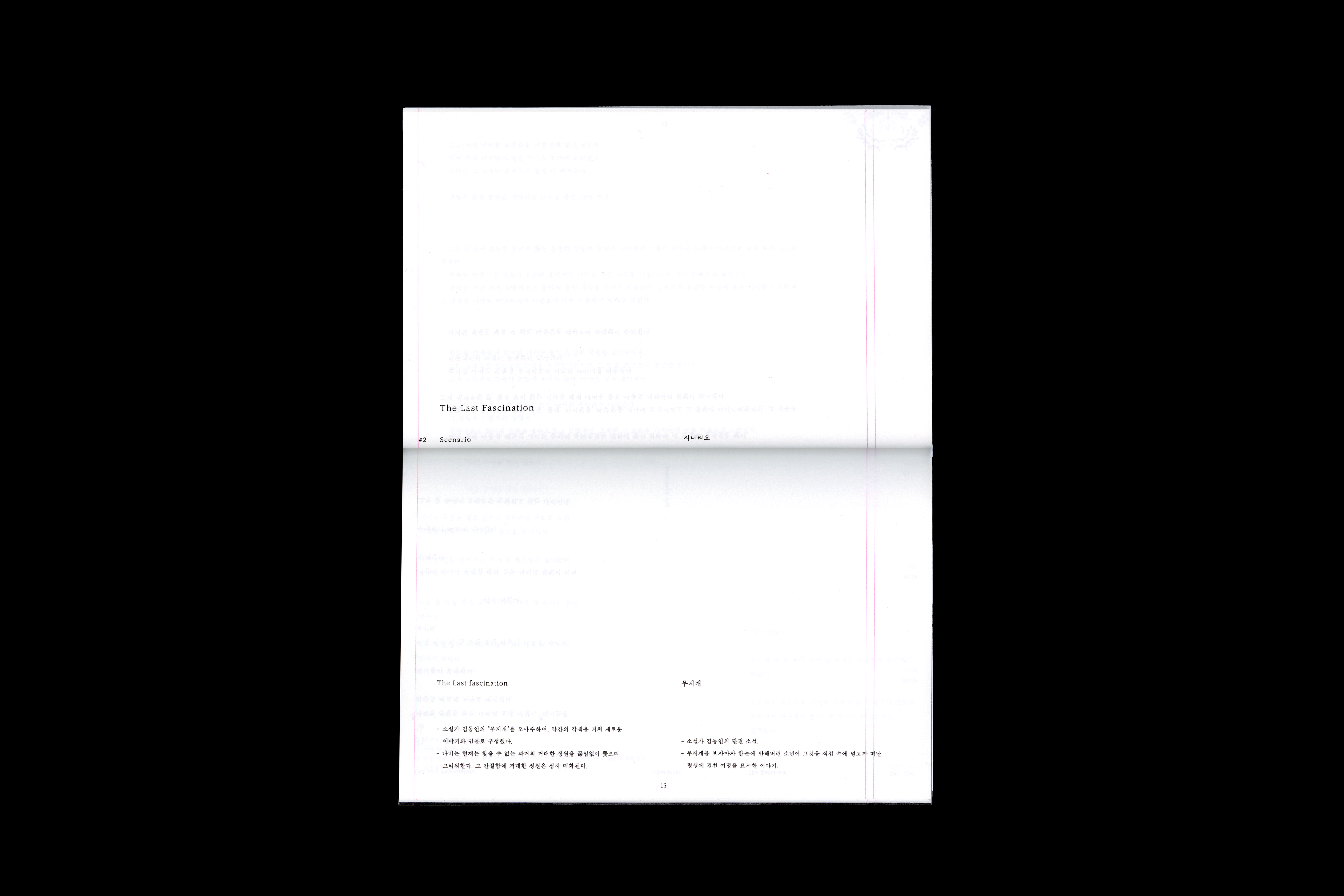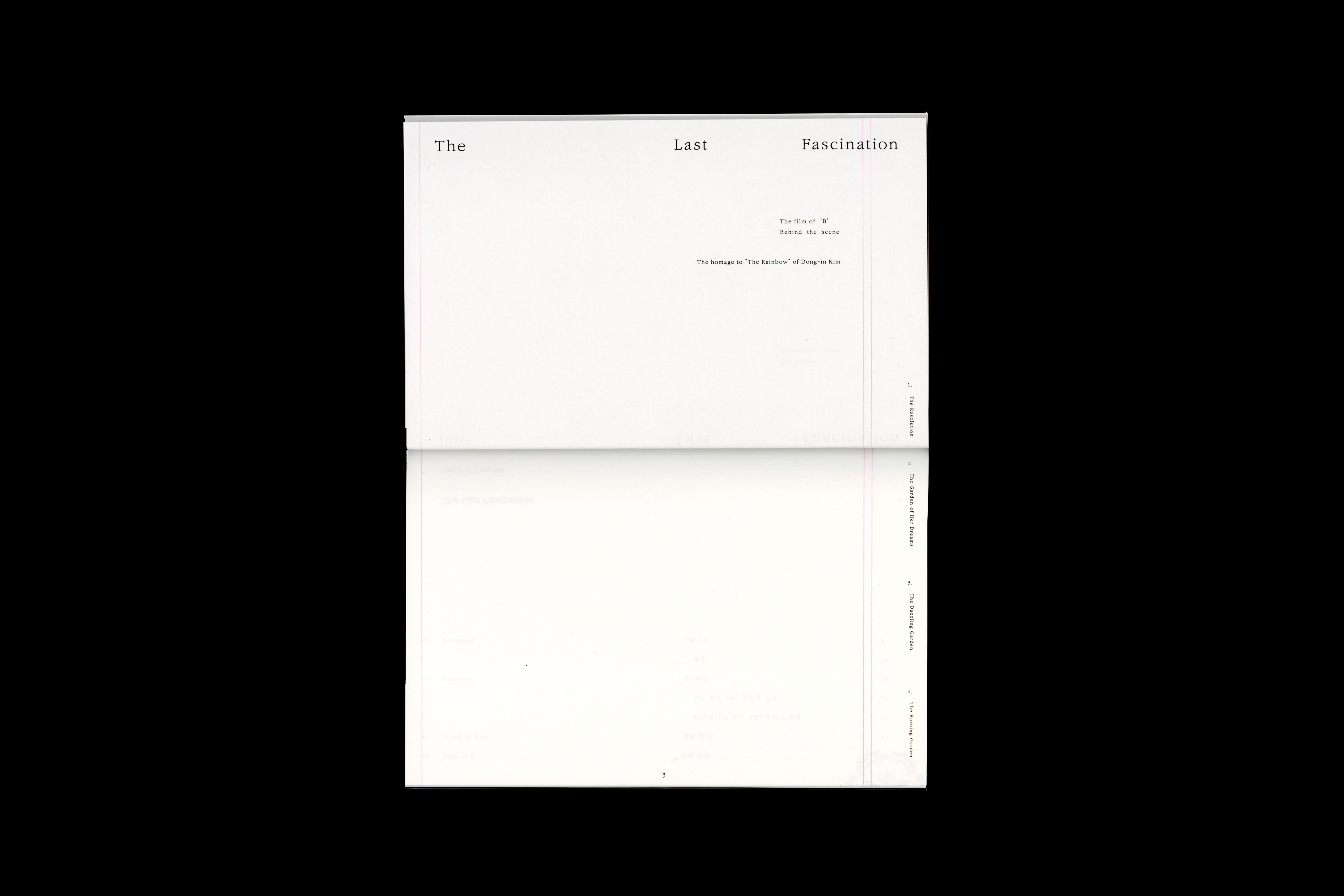Based on the book size of the script book, the layout was designed to place texts at both ends so that "The Rainbow" and 'The Last Fascination' could be compared.