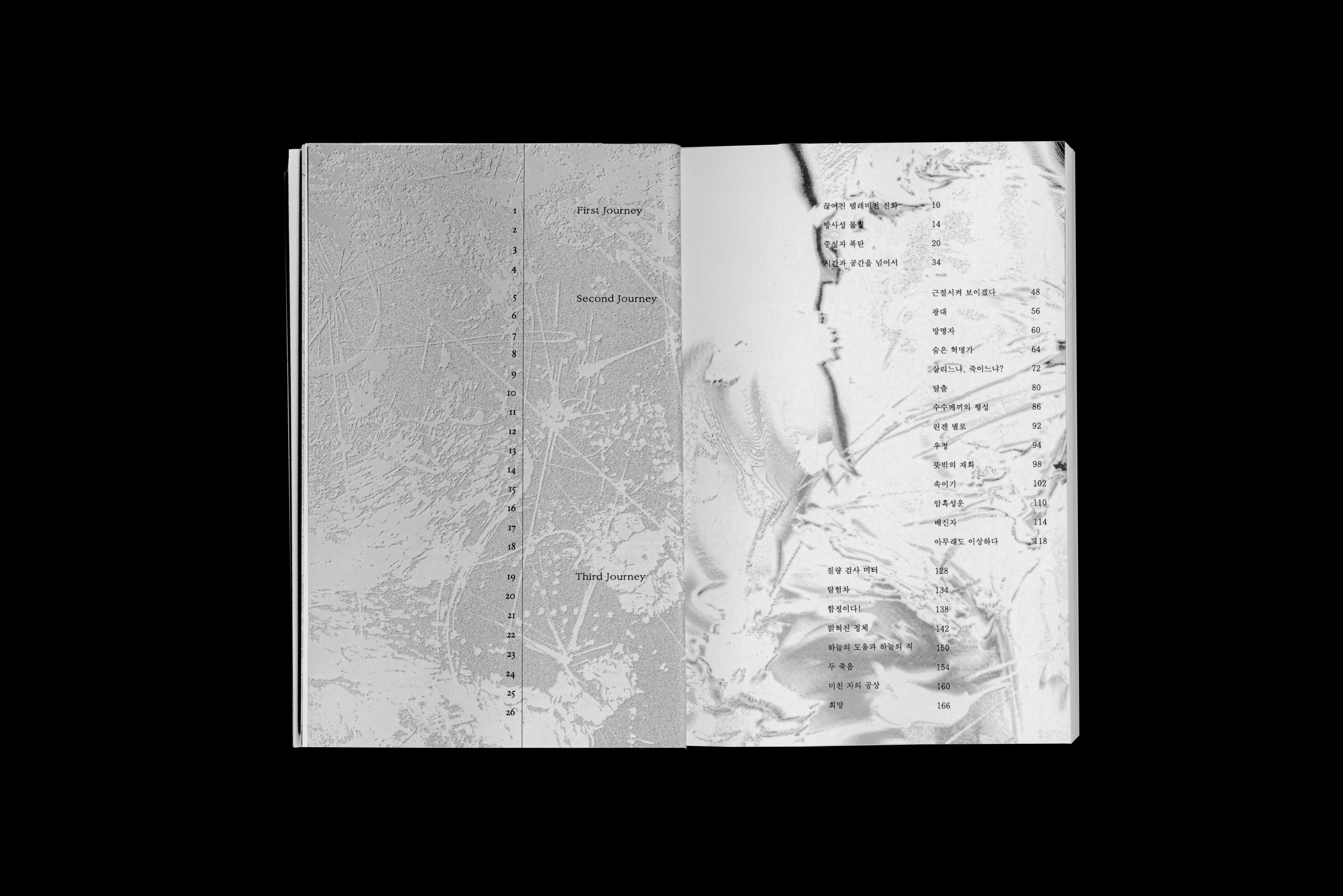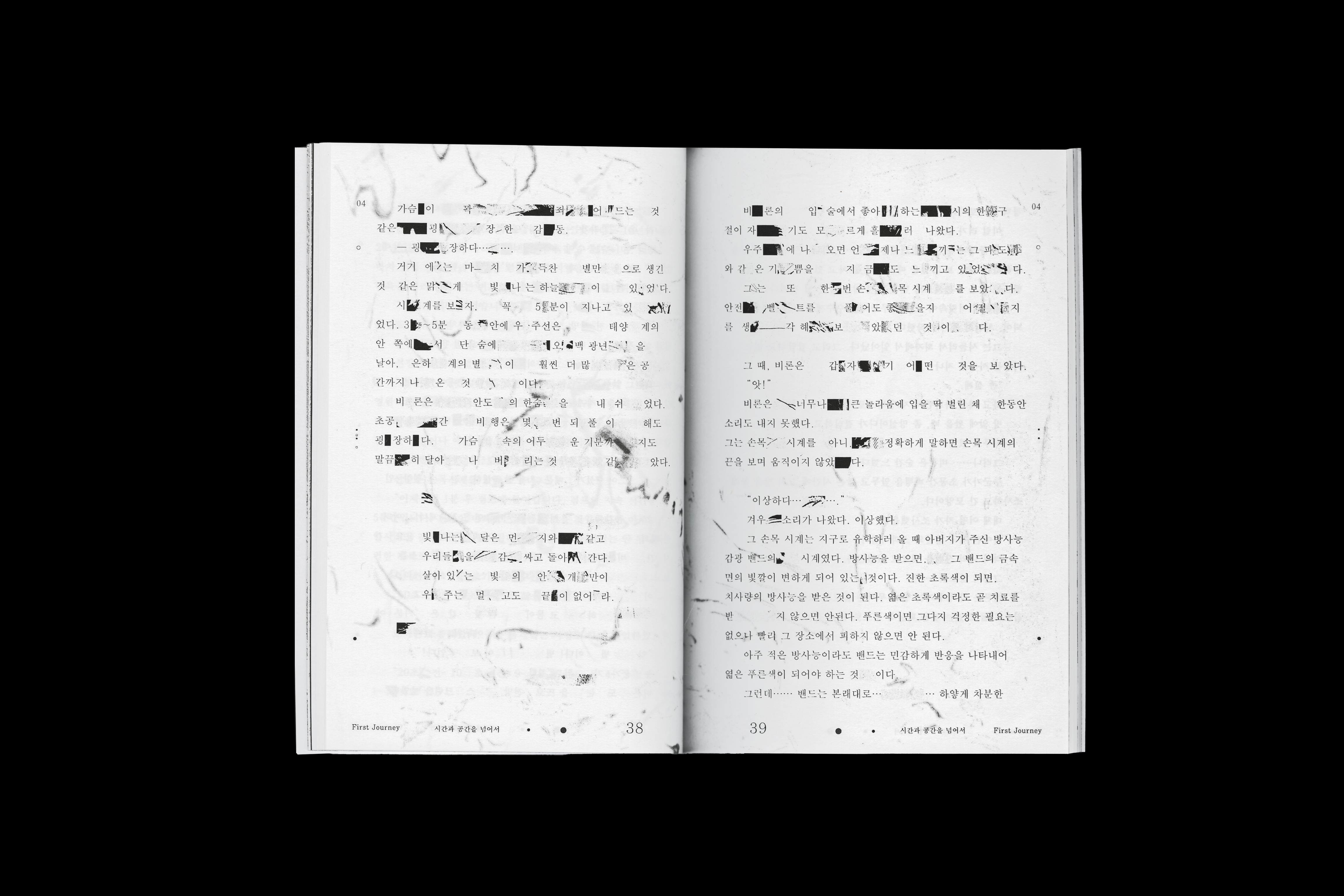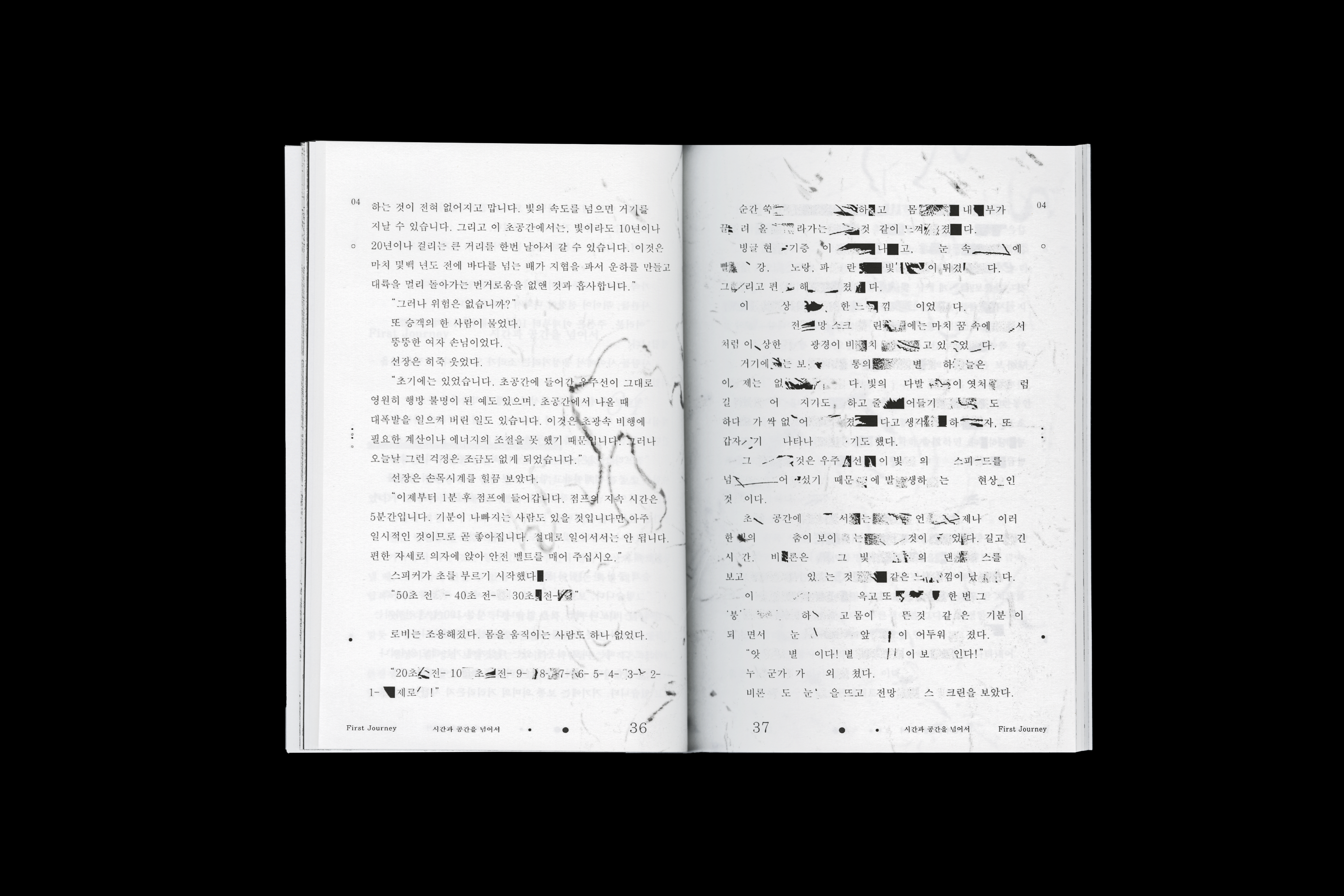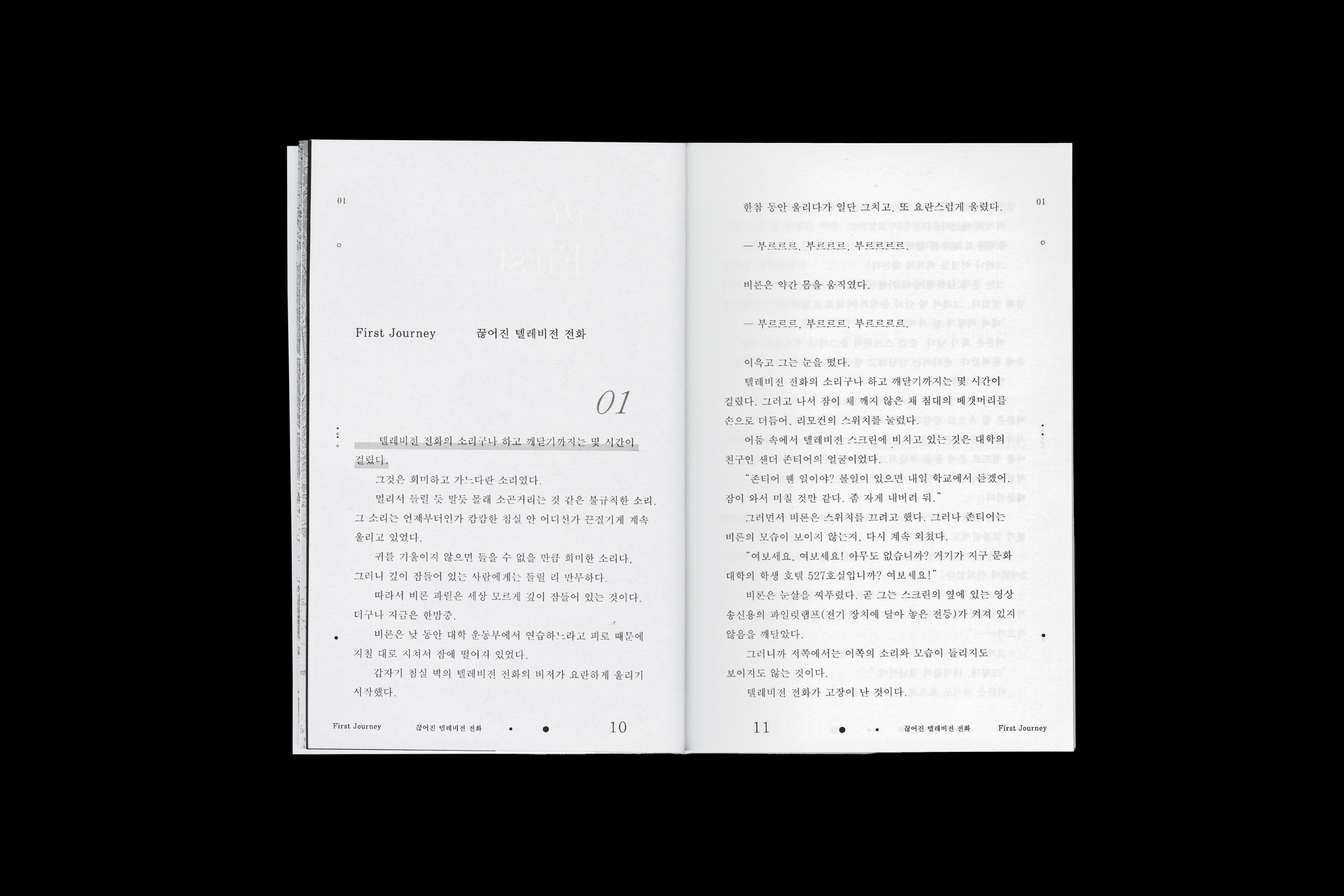 The identity of the book was designed with the keyword of traveling the space through the space jump. The cover depicts the main character's space travel, and inside, it is composed of a graphic depicting the space jump. On the space jump page, graphics were put between syllables so that the letters were not read normally and the reading speed was delayed as if space and time were flowing abnormally.