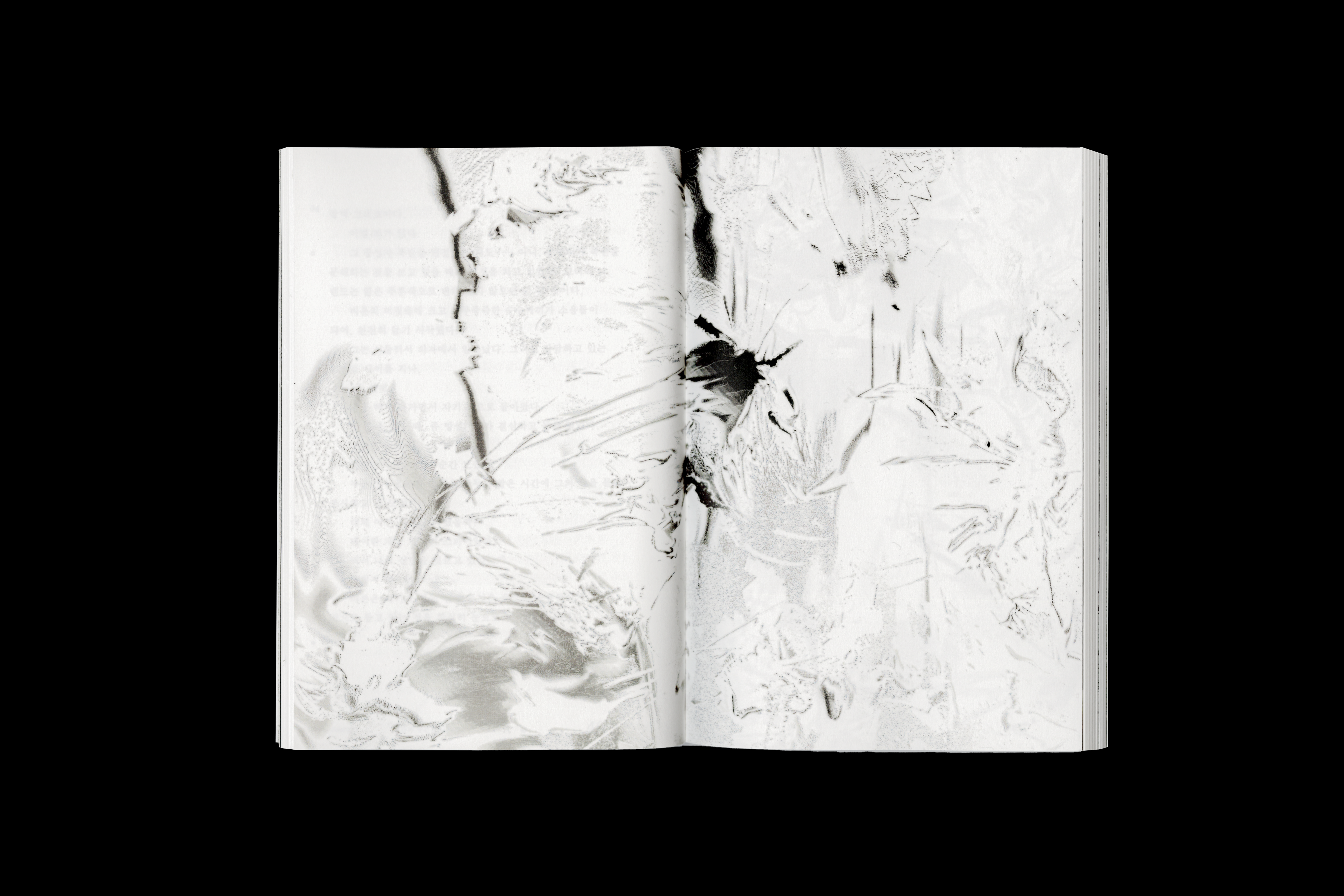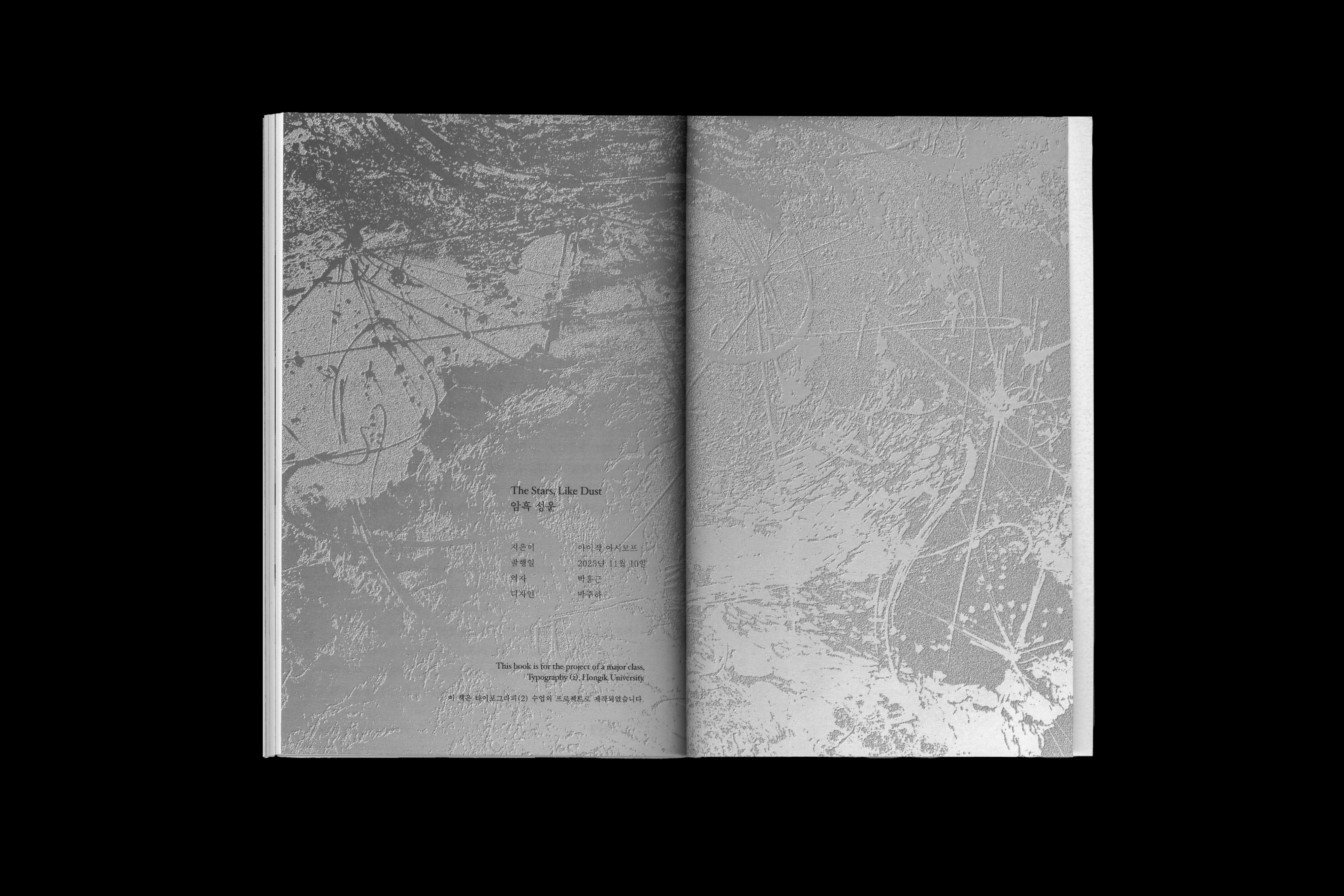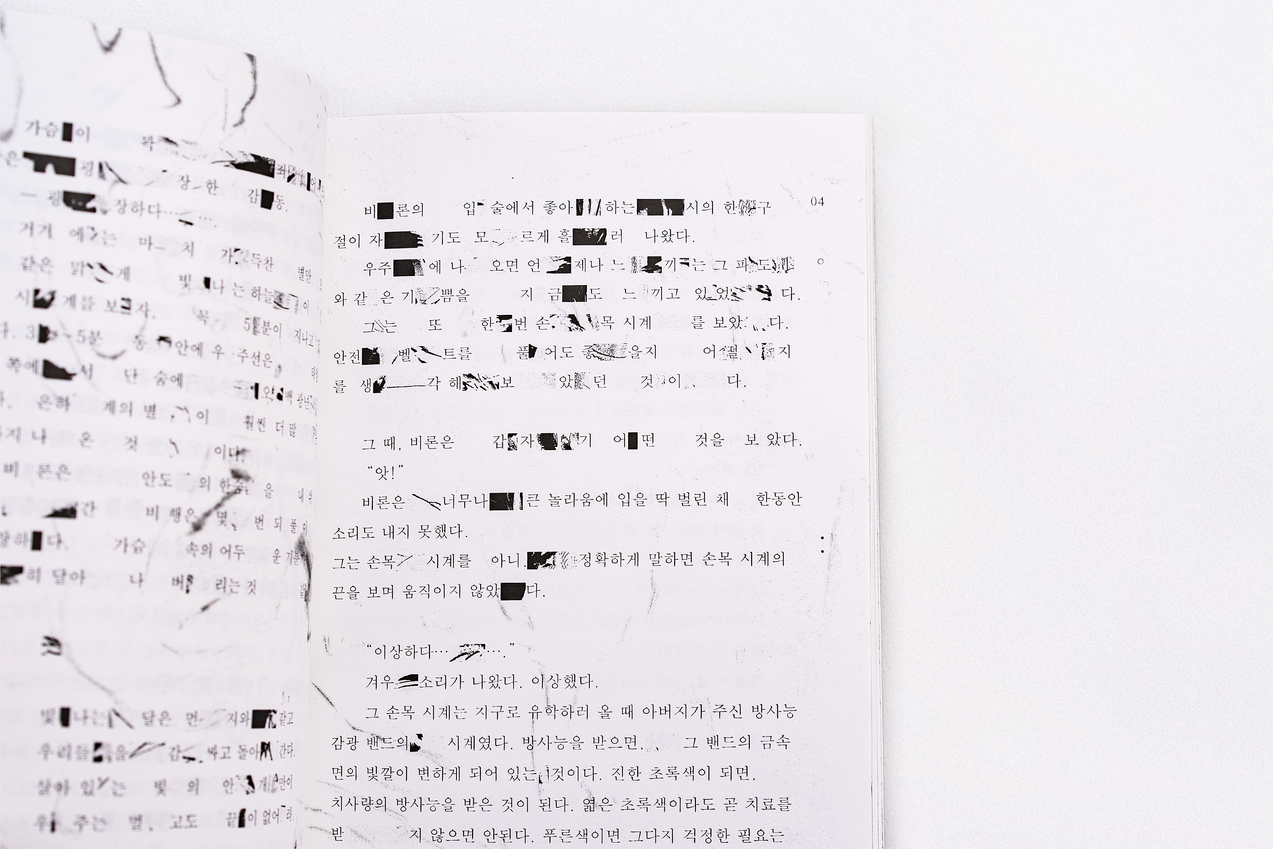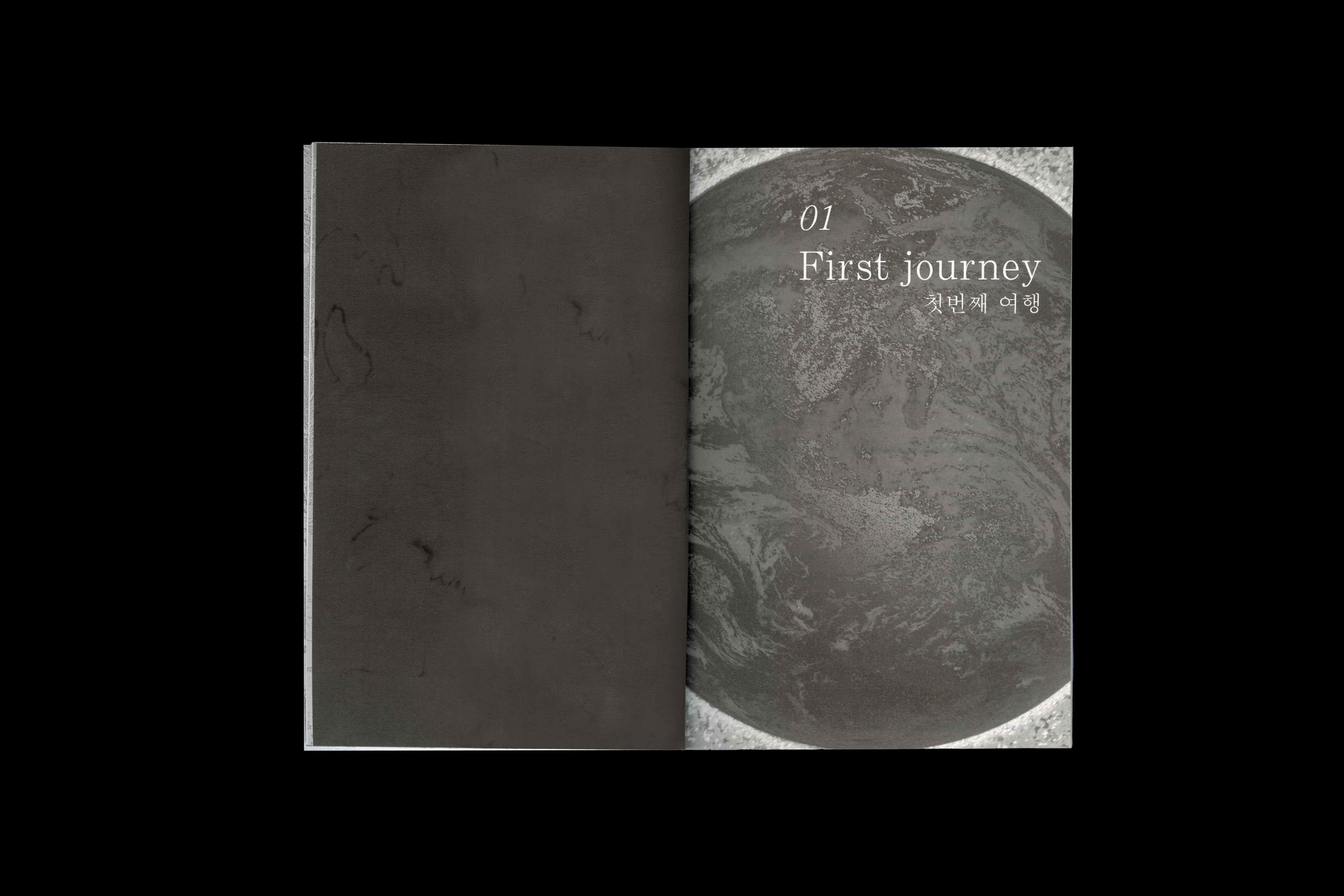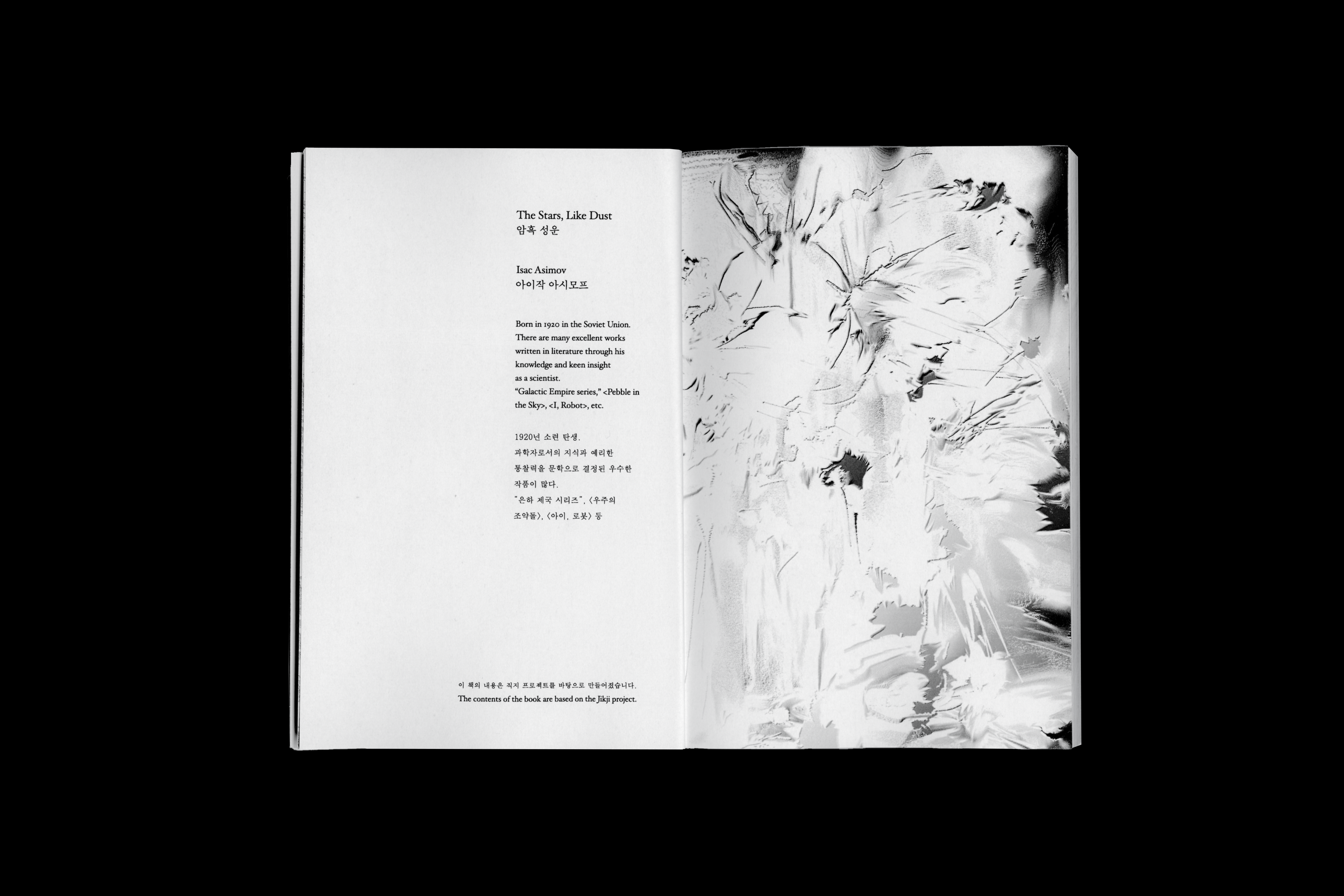 The identity of the book was designed with the keyword of traveling the space through the space jump. The cover depicts the main character's space travel, and inside, it is composed of a graphic depicting the space jump. On the space jump page, graphics were put between syllables so that the letters were not read normally and the reading speed was delayed as if space and time were flowing abnormally.